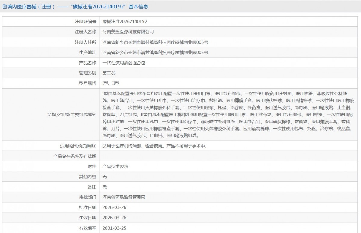 温馨提示:1.一次性使用清创缝合包可能含有禁忌内容或者注意事项,具体详见说明书;2.购买一次性使用清创缝合包后应仔细阅读一次性使用清创缝合包说明书或者在医务人员的指导下购买和使用;3.以上一次性使用清创缝合包内容均来自于生产厂家、代理商网站不作为宣传购买依据如与一次性使用清创缝合包说明书有冲突的,均以一次性使用清创缝合包说明书为准;